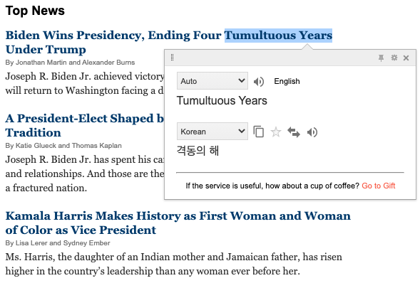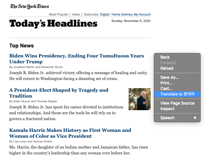애플의 맥북을 사용하시면, 맥북에 내장된 번역기능을 사용하셔도 좋고, 윈도우를 사용하시면 구글 크롬브라우저를 설치한 후에 구글 트랜스레이터 플러그인을 깔아 웹브라우저에서 자동으로 영어가 한국어로 변환되는 기능을 사용합니다.