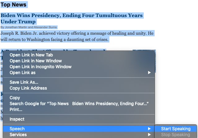 이 부분도 맥북을 사용하시면, 맥북에 이미 탑재된 내장 기능을 아래처럼 사용하시면 되고, 윈도우를 사용하시면 네이버의 파파고 플러그인을 설치하여 컴퓨터에게 뉴스를 영어로 읽어달라고 요청합니다.